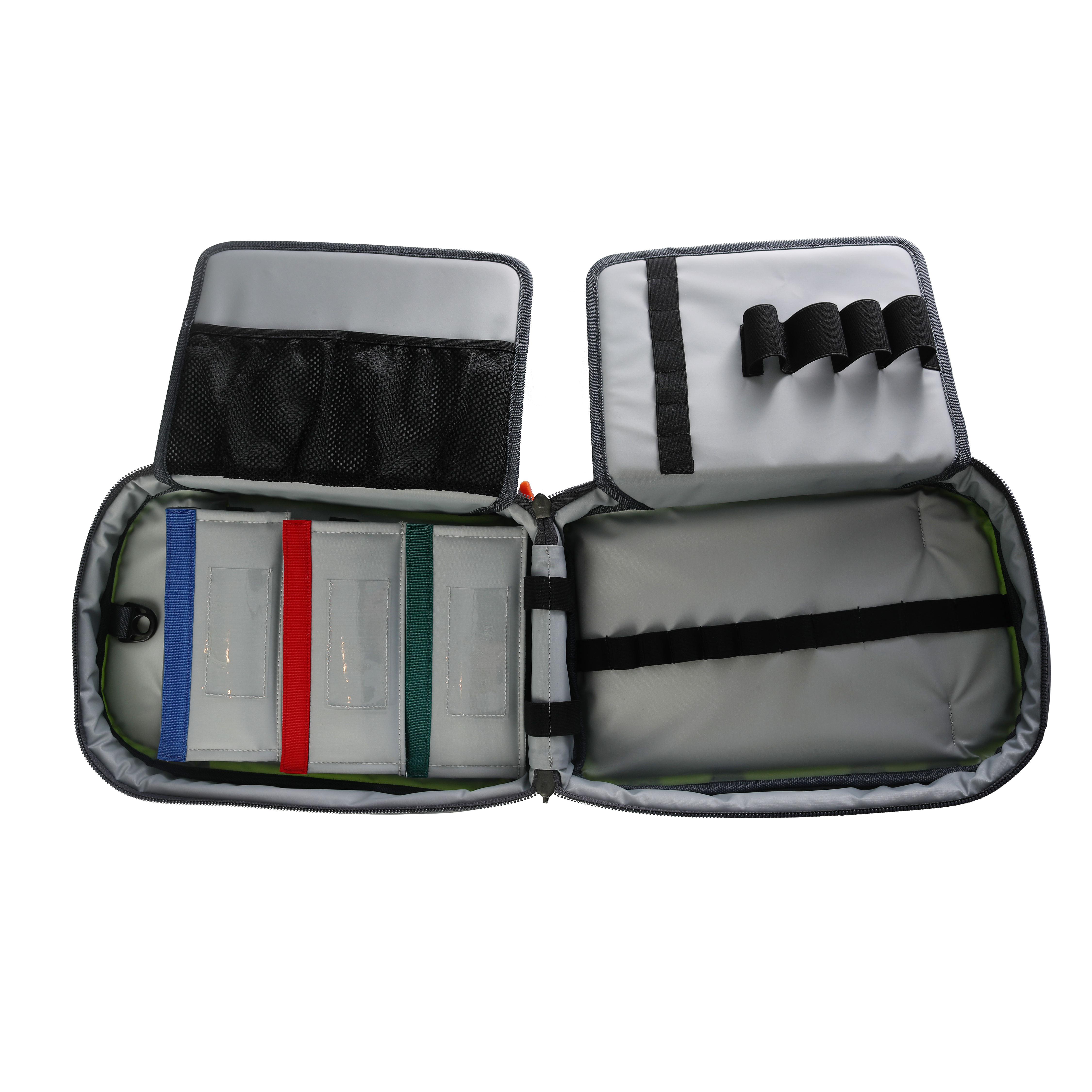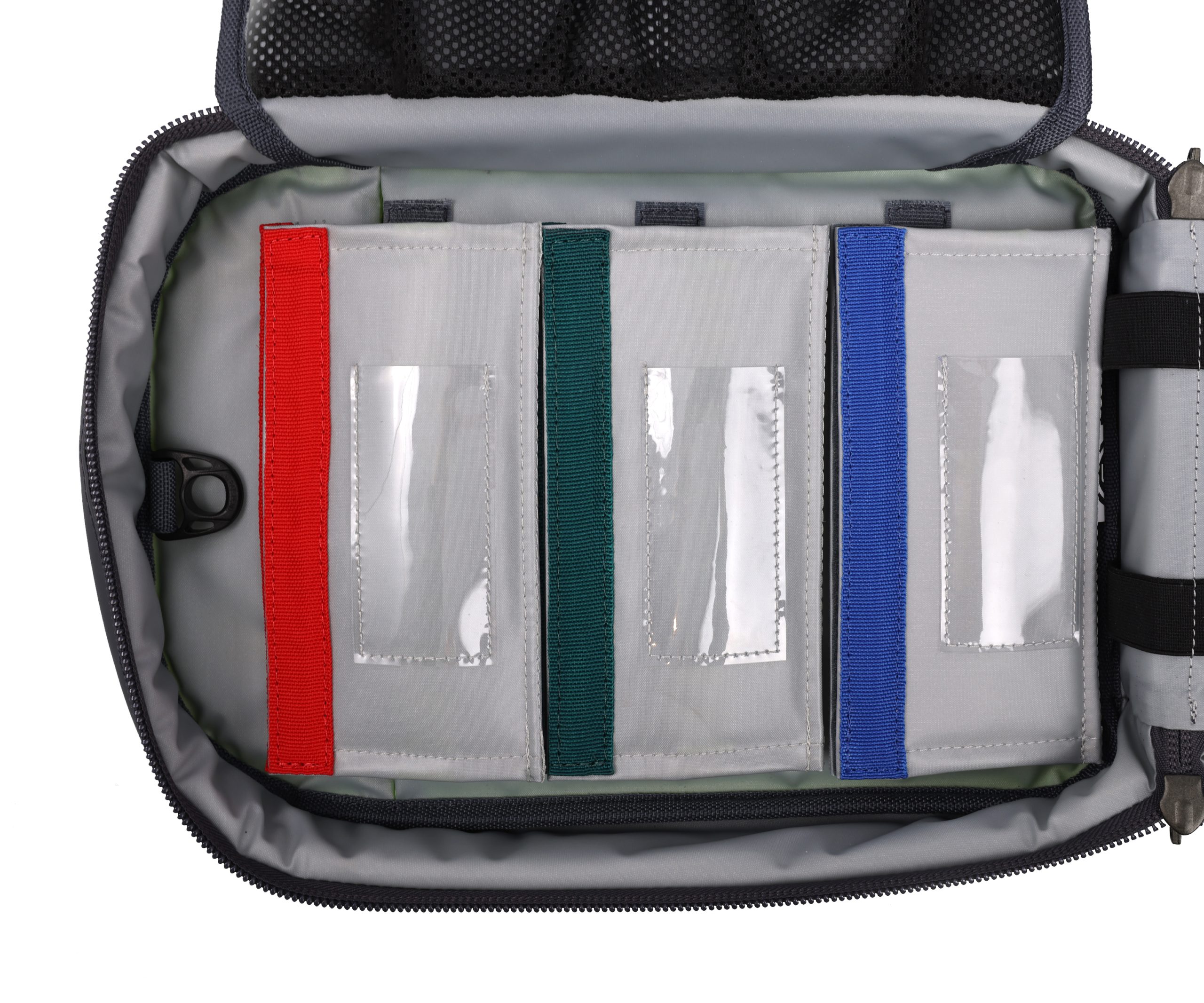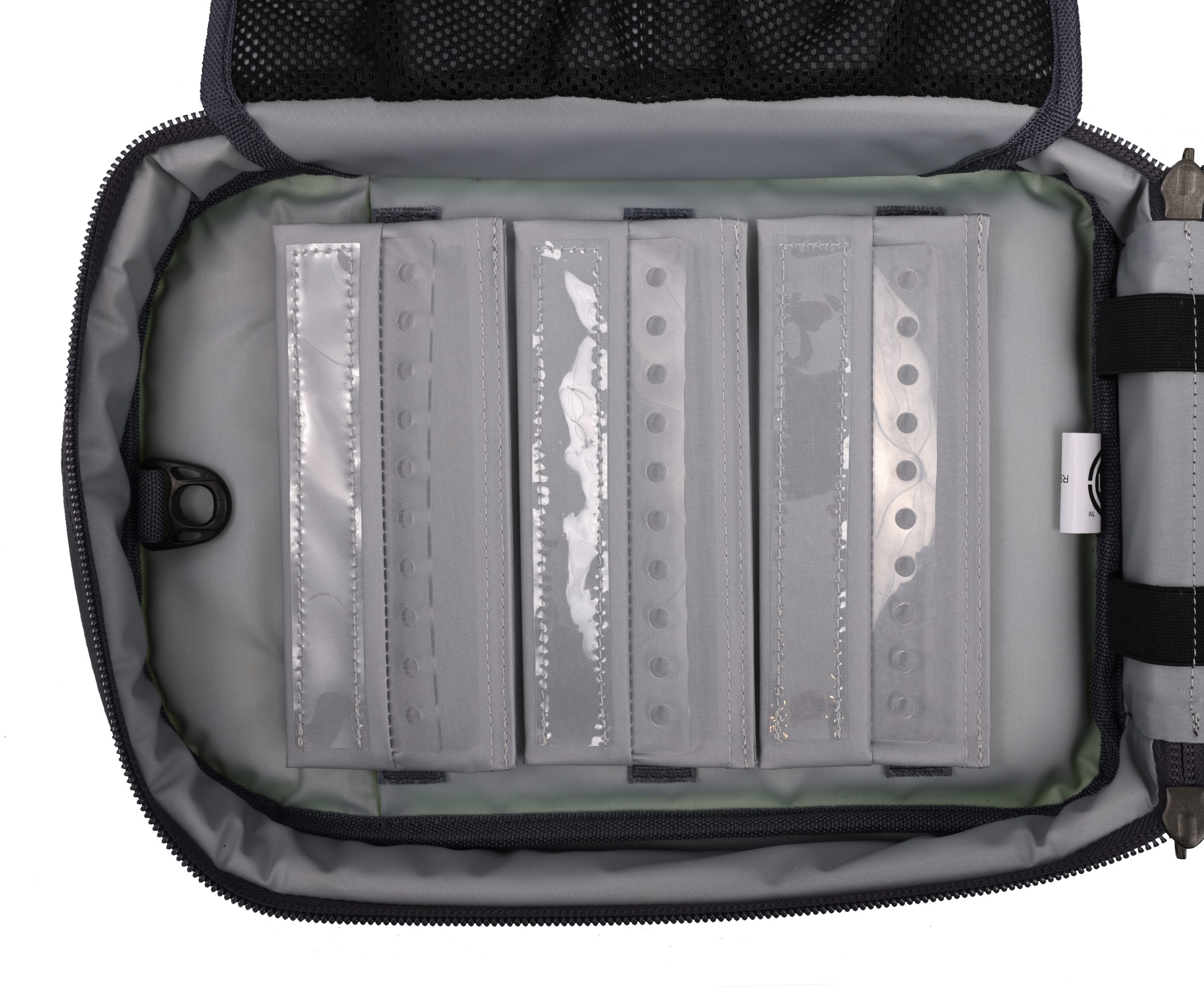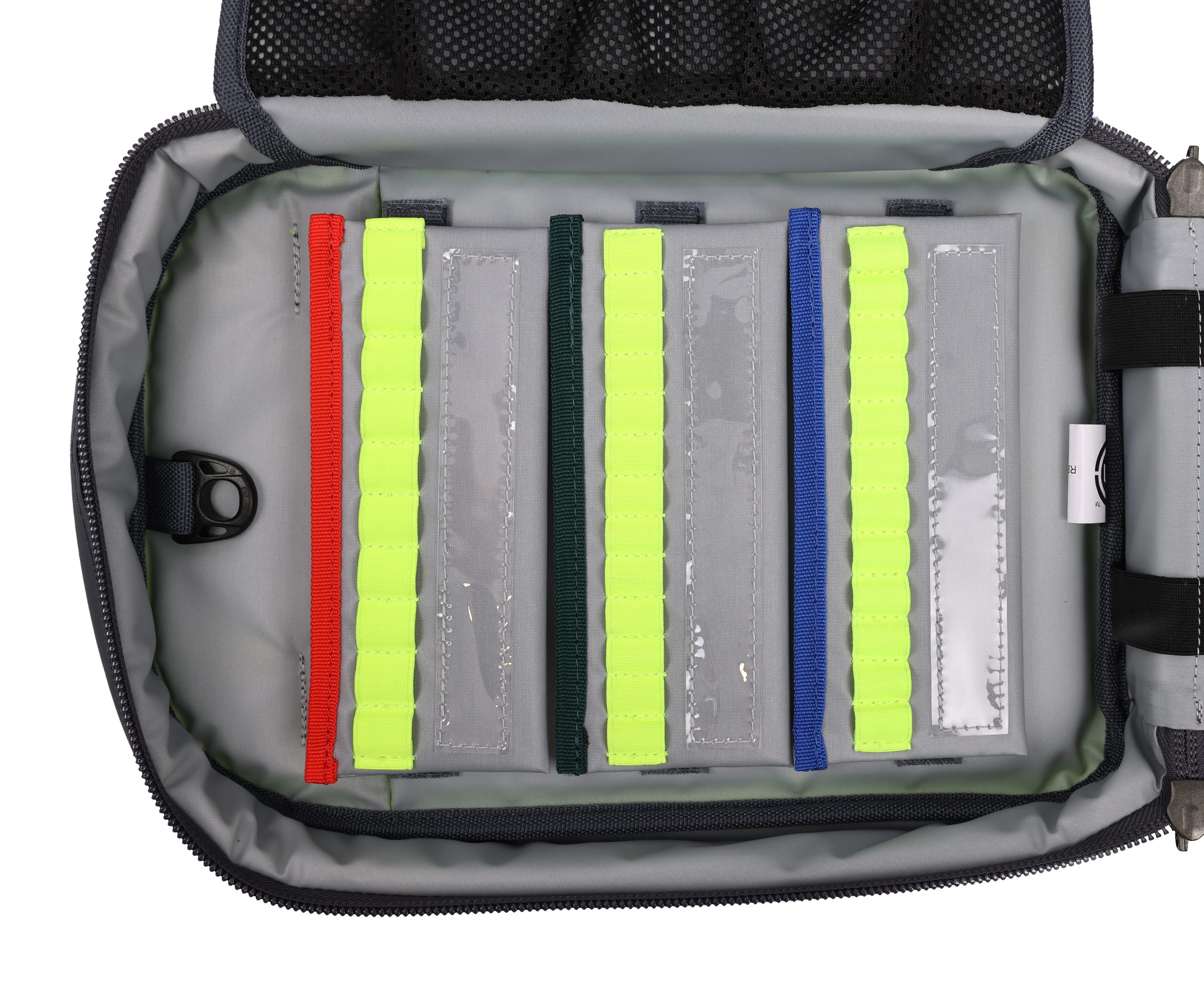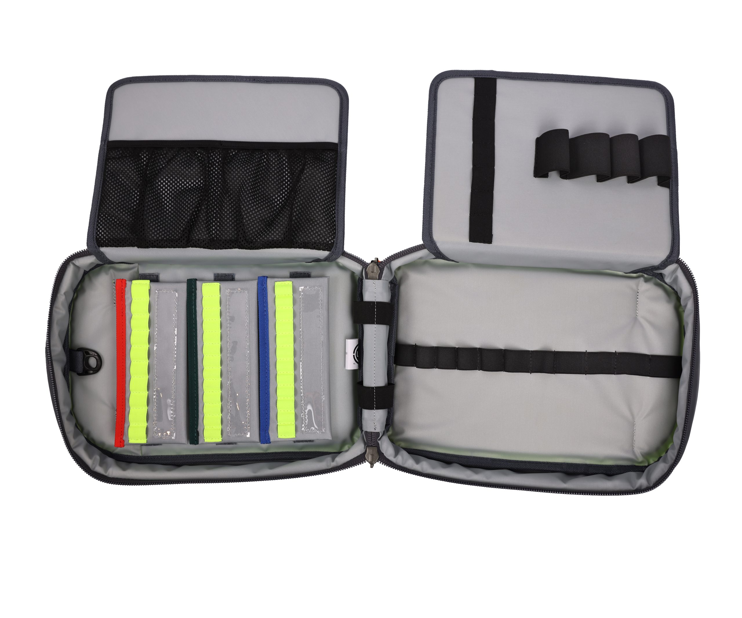 Inside, the medicines bag features multiple inner pockets, sleeves, elastic loops, and netted sections — all designed to organise your drugs into clearly defined compartments for quick and reliable access. Choose between padded ampoule wallets or sturdy ampoule strips for additional storage, both of which attach securely with VELCRO® Brand Hook and Loop.