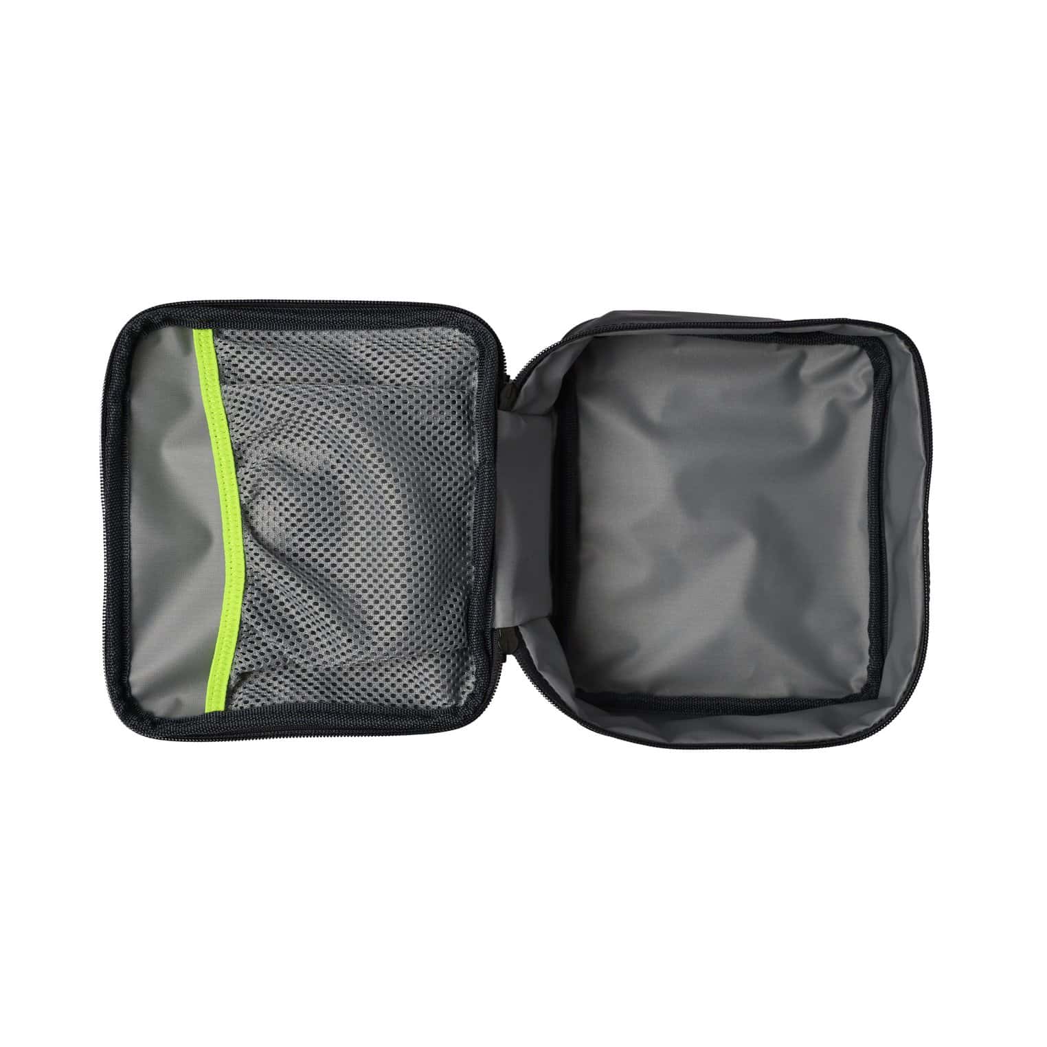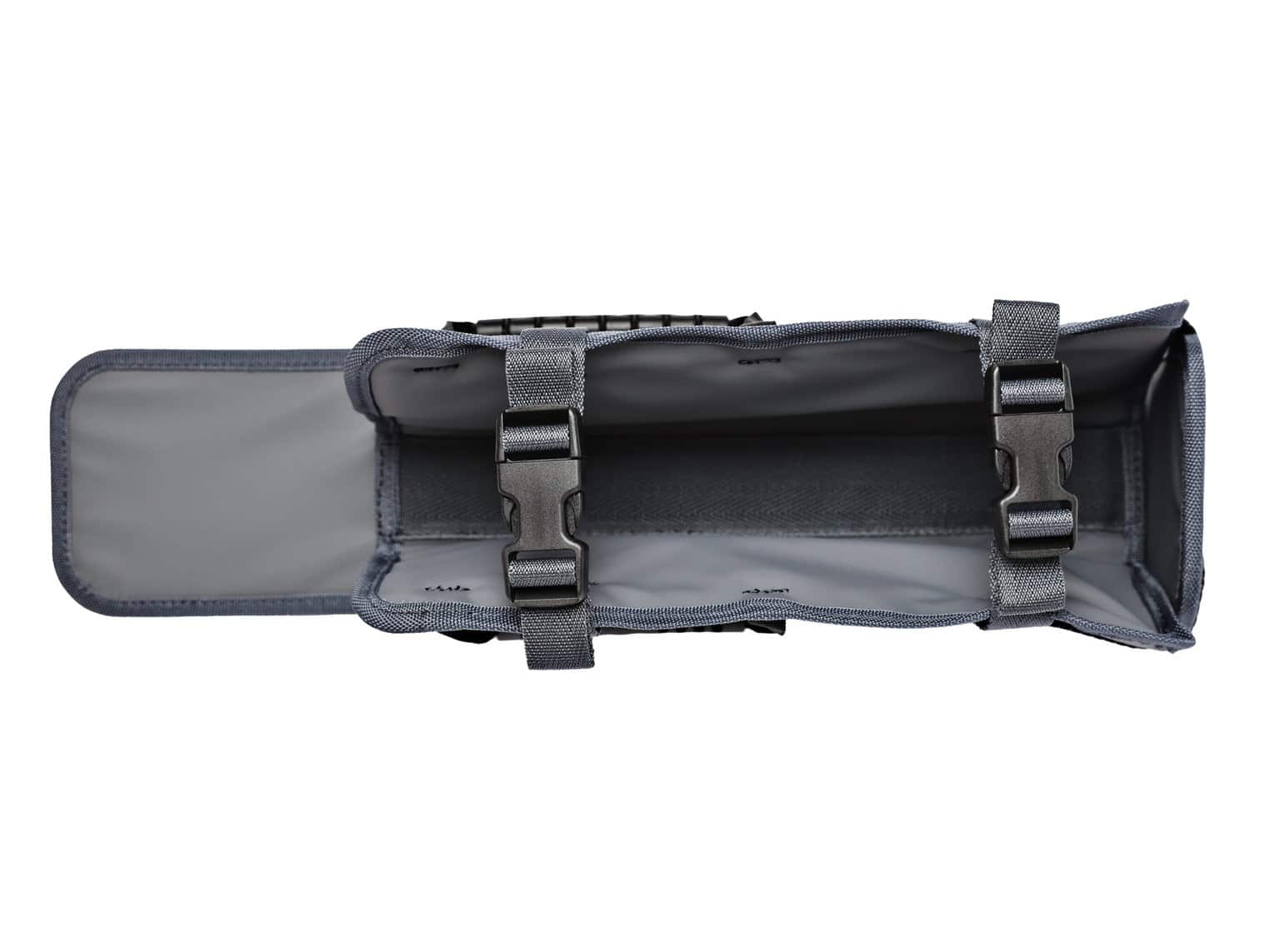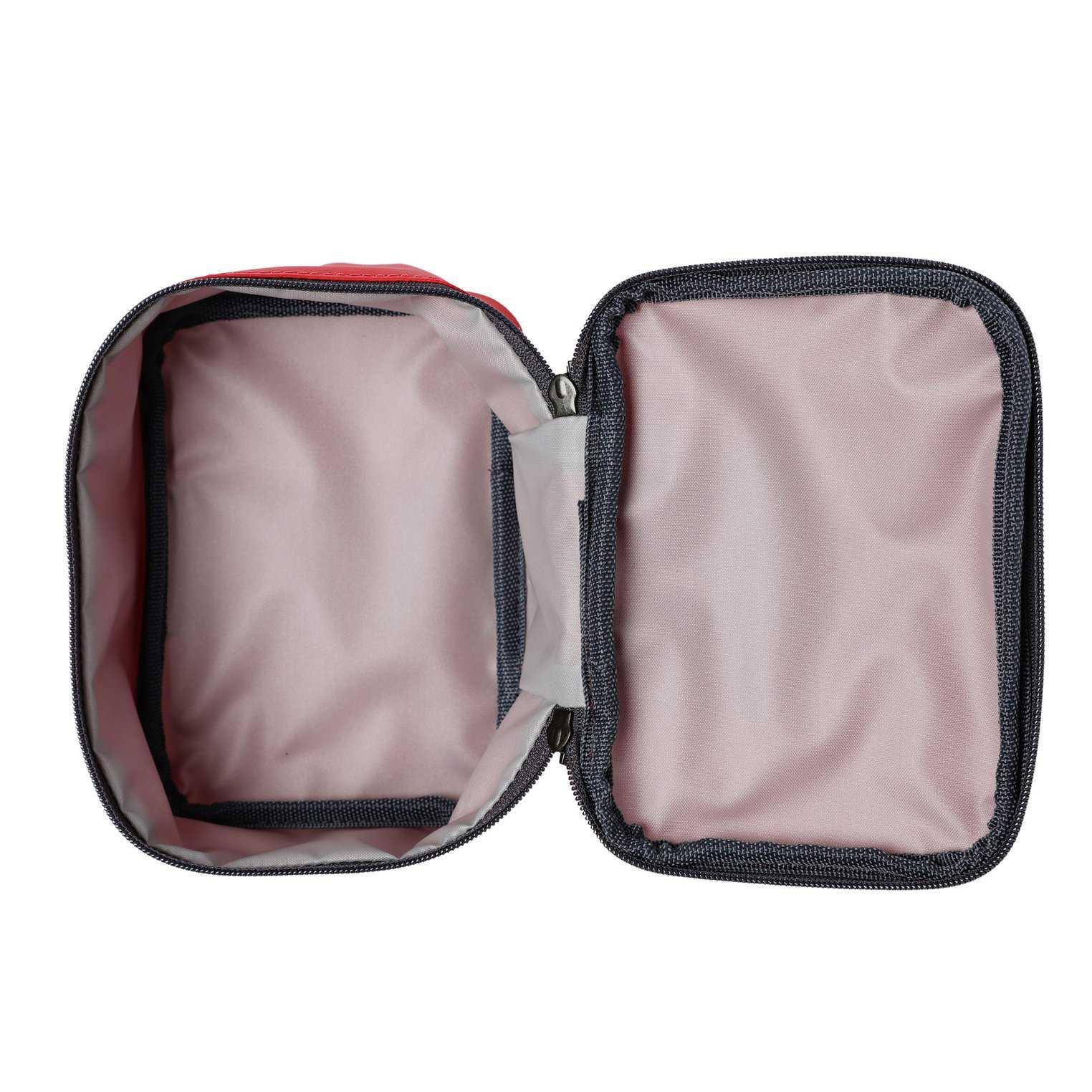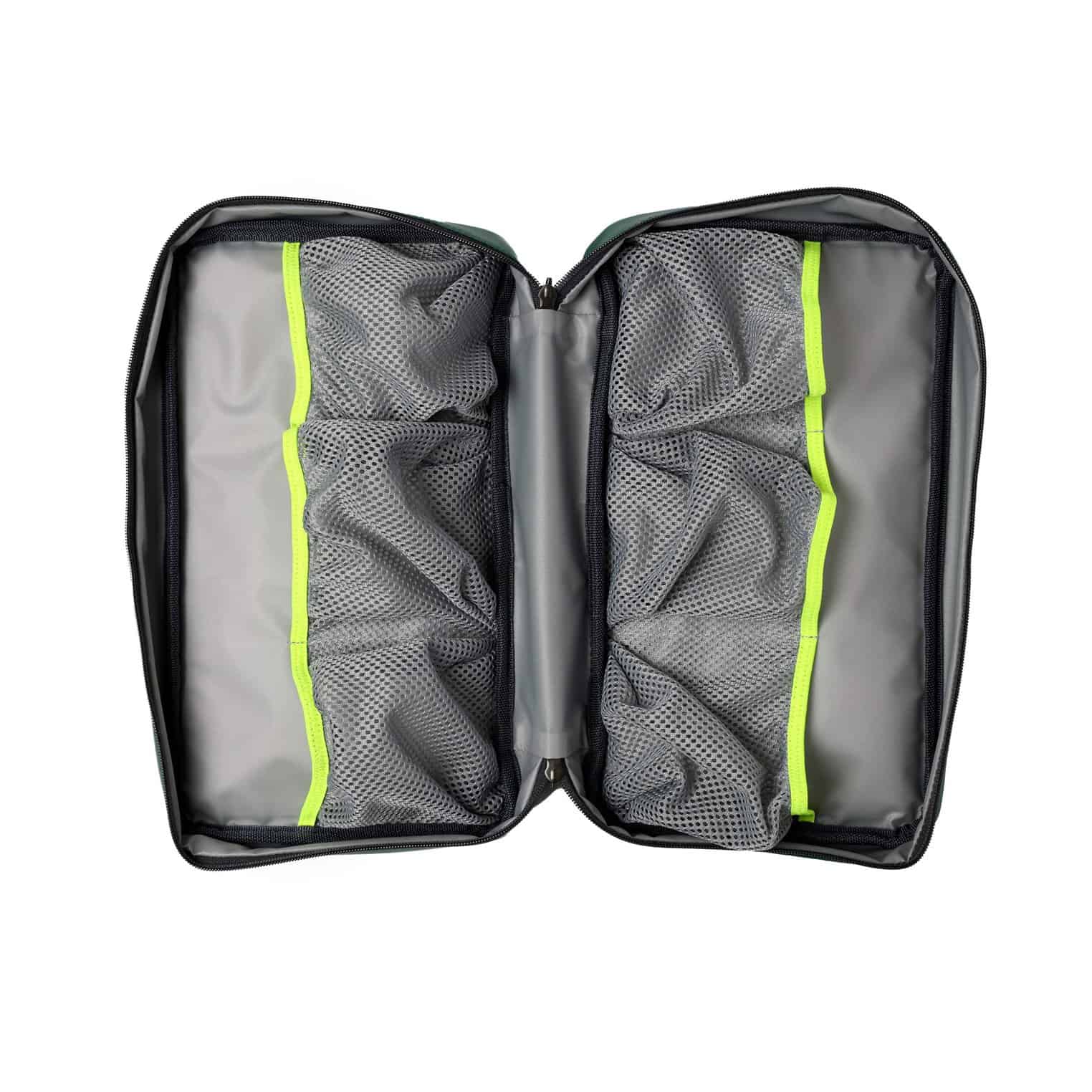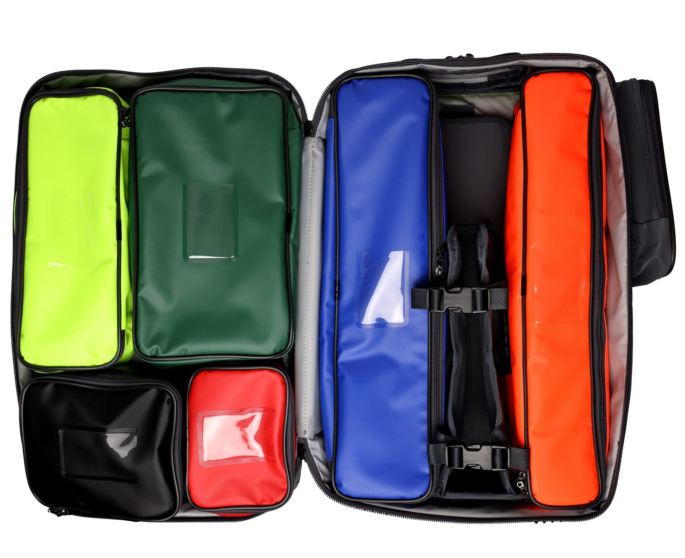 The main bag opens out flat to reveal 6 individual pouches with clear ID windows on the front for labelling.