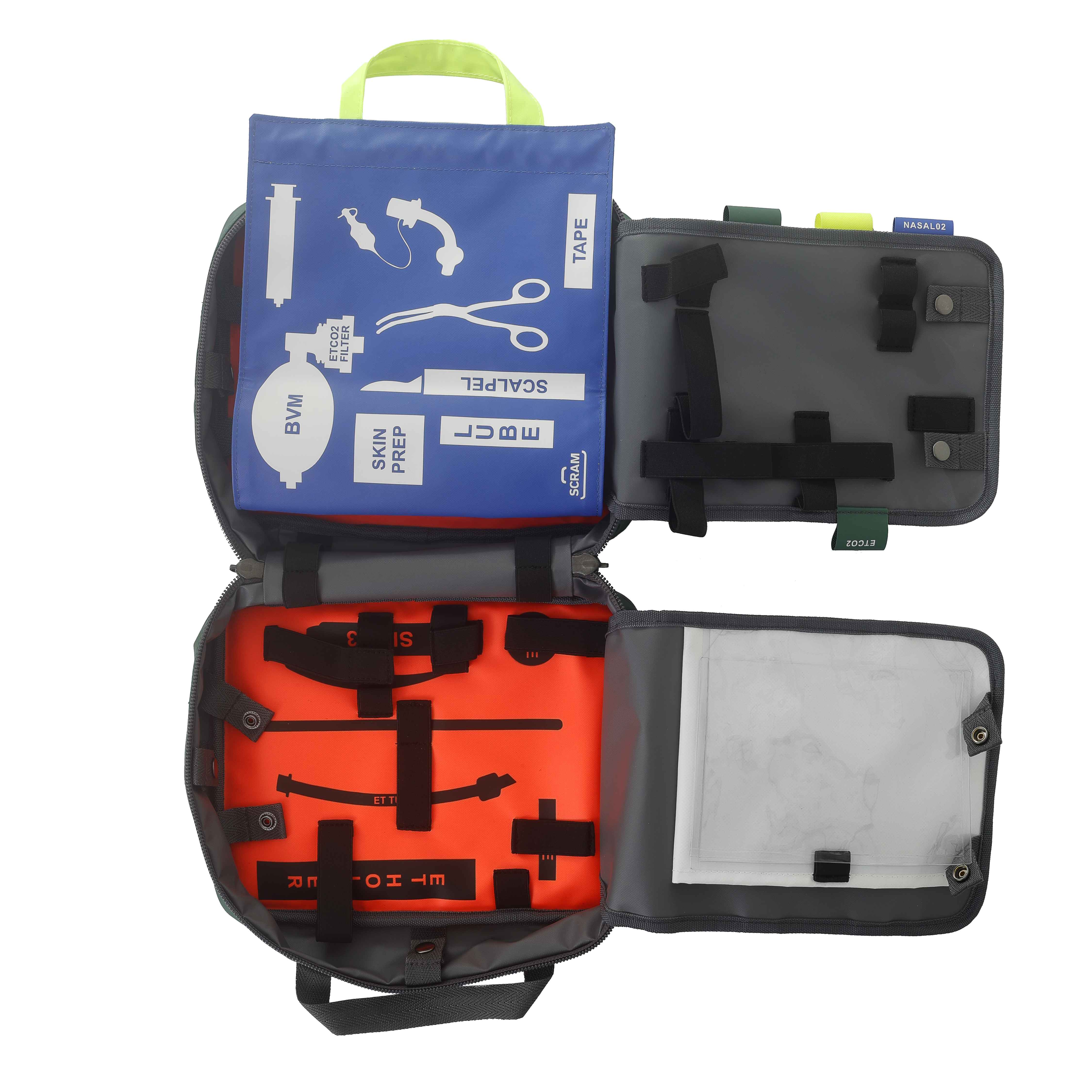 One of five new additions to the SCRAM™ family, this bag incorporates the principles of Tactical Combat Casualty Care and BATLS. Tactical SCRAM™ is an emergency airway bag designed to enhance the performance of emergency airway management within the tactical environment by providing a compact, structured, reproducible approach.